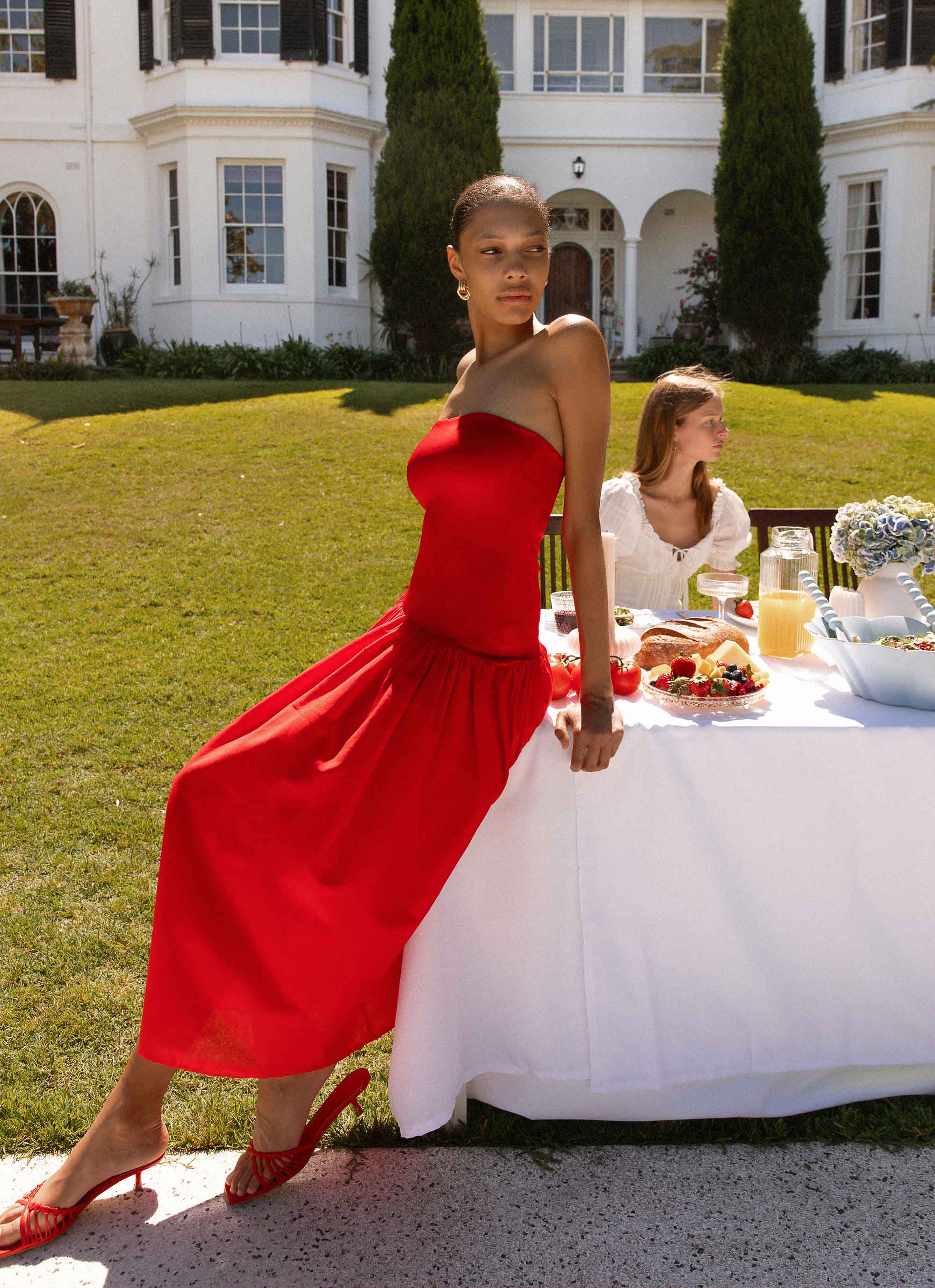 The Domino Effect Midi Dress is all about bold elegance. With a strapless neckline and an asymmetrical drop waistline that creates a striking silhouette, this dress effortlessly balances sophistication with edge.